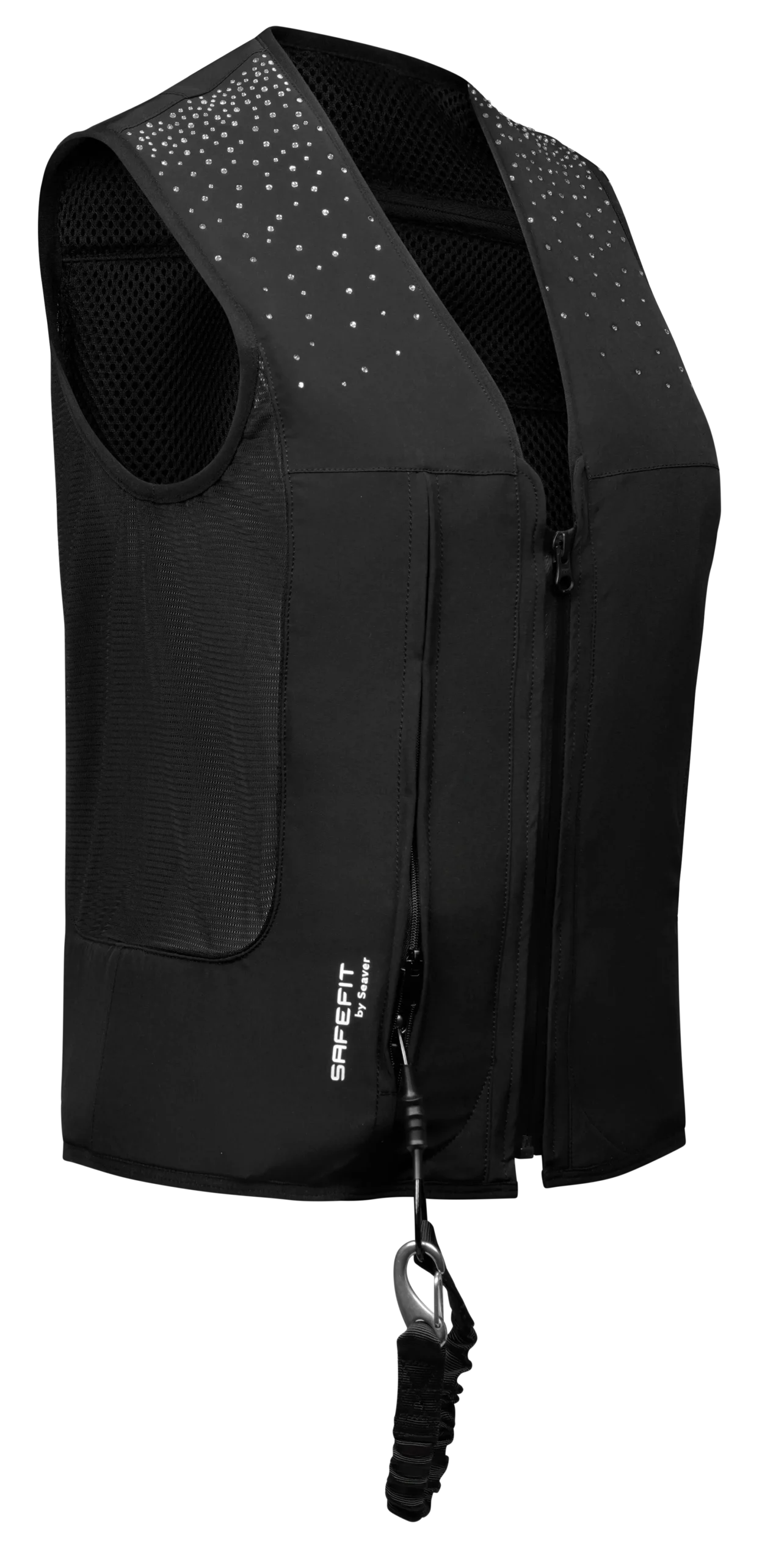 En cas de chute, le gilet airbag SAFEFIT Crystal Rain protège vos zones vitales grâce à un déclenchement ultra-rapide. Mais surtout : il met en lumière votre élégance.